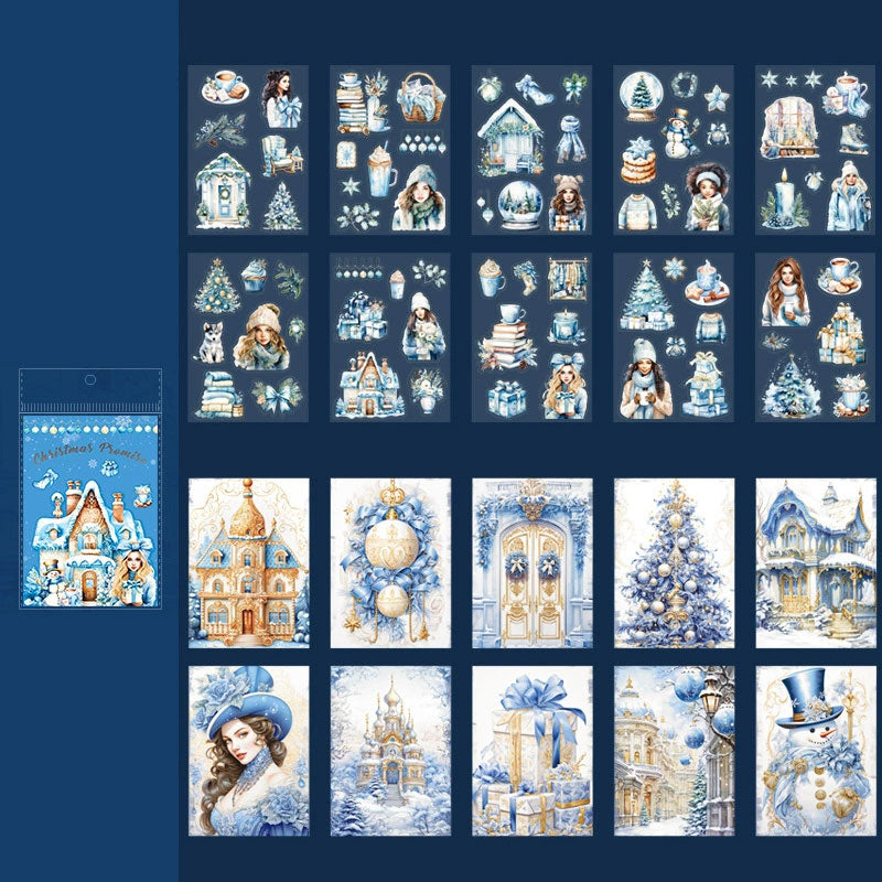 Chłodny błękit, biel i złote detale tworzą spokojny, zimowy nastrój. Ilustracje wyglądają jak kadry z bajki: domy w śniegu, bombki, choinki, delikatne ozdoby – idealne na czas świąt.